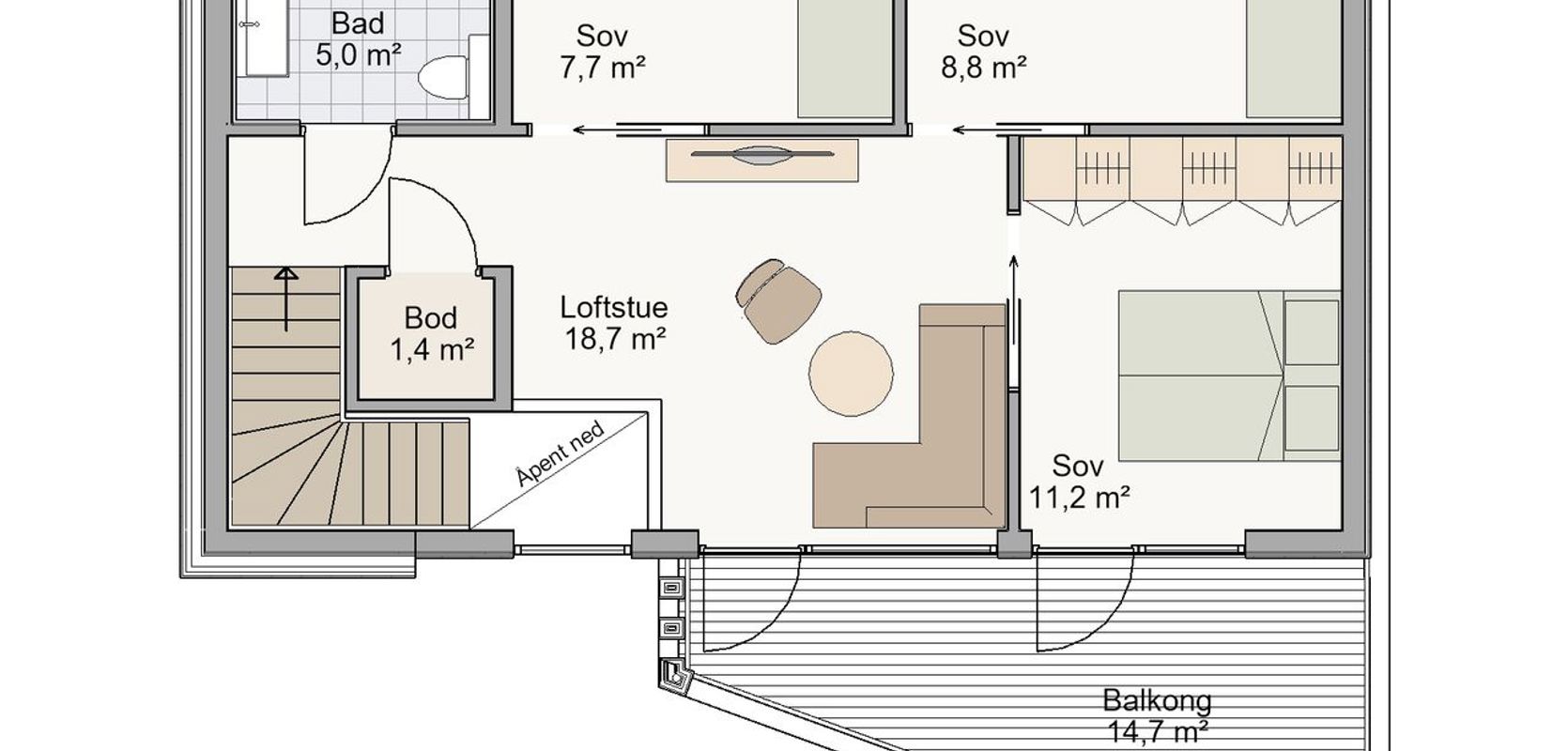 Form 2.0 er spesielt egnet for smale tomter, med sin bredde på 6,4 meter og et bebygd areal på under 100 kvadratmeter. Balkongen i andre etasje er fleksibel og kan tilpasses både etter tomten og dine ønsker og behov. Fleksibiliteten til Form 2.0 gjør det mulig å tilpasse huset til forskjellige tomter og konfigurasjoner, enten det er som enebolig, tomannsbolig eller enebolig i rekke.
