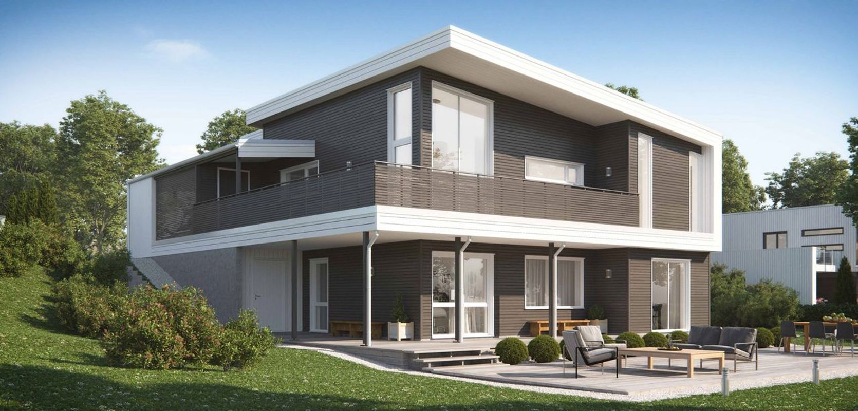 Signatur 306 er tilpasset skrå tomt, og hovedinngangen ligger på øvre plan, med kort vei til carporten. Rett ved siden av inngangen har du direkte adkomst til en utvendig sportsbod. Huset har også en stor, flott terrasse tilgjengelig fra stuen.