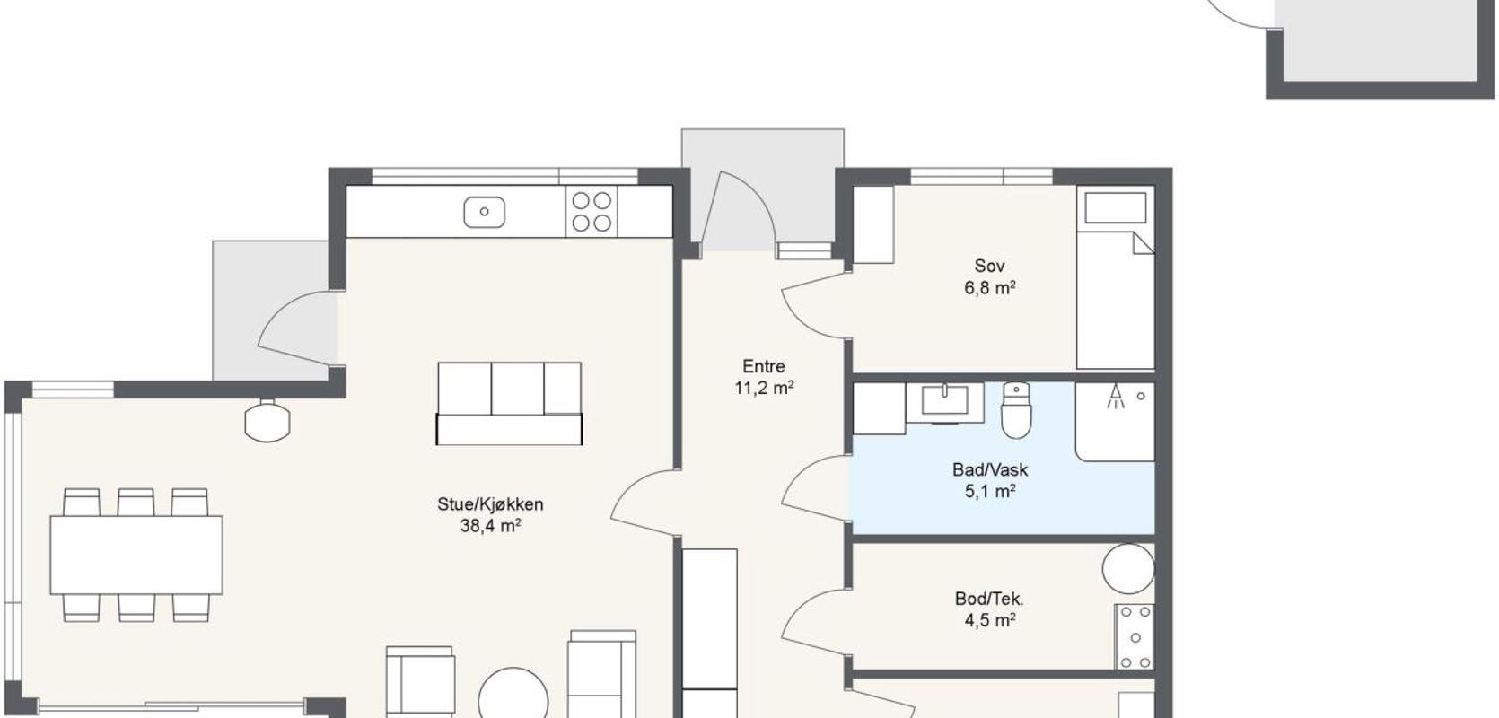 På den ene siden av gangen finner du to komfortable soverom, med badet og det tekniske rommet/boden strategisk plassert mellom dem. Badet er utstyrt med en dusjsone, toalett, servant i skap og vaskemaskin. På den andre siden av gangen trer du inn i hyttas sosiale sone, som består av stue, kjøkken og spiseplass.